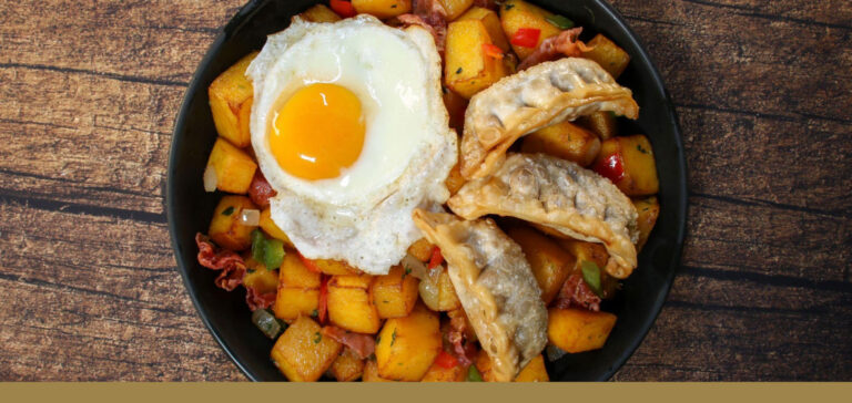 Apple Pie Potstickers are fried and served over a hash made with butternut squash, prosciutto, peppers and onion finished with a fried egg and a drizzle of hot honey. Yield: 1 servings