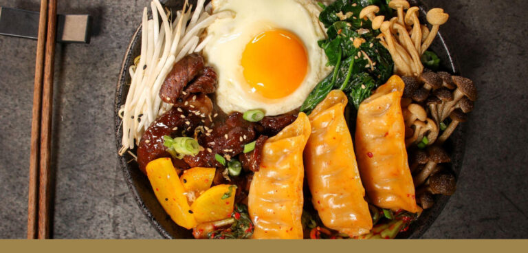 Kimchi Chicken Potstickers top fragrant rice with beef bulgogi, sauteed spinach and mushrooms, garnished with pickled daikon, bean sprouts, scallion, and topped with a fried egg. Yield: 1 Servings