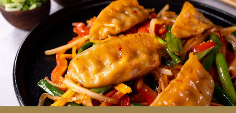 A stir fry made with Kimchi Chicken Potstickers, sliced peppers, onion, carrots, green onion, and a spicy gochujang sauce. Yield: 3 Servings