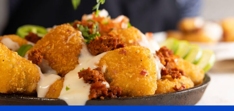 Crispy Pepper Jack and Tequila Lime Flavored Mac & Cheese Bites, smothered in queso blanco, topped with chorizo and garnished with fresh jalapeño, cilantro and lime wedges. Yield: 3 servings