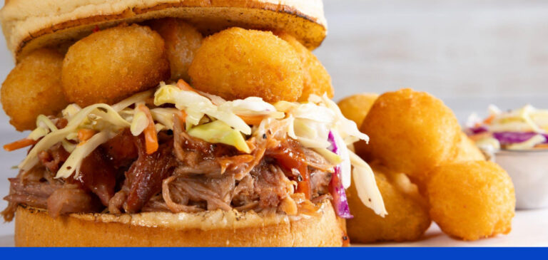 A savory pulled pork sandwich topped with crispy Salt and Vinegar Cheese Curds, balanced with a tangy sauce and soft bun. Yield: 3 servings