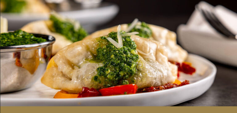 Spinach Artichoke Potstickers served with fresh basil pesto garnished with sautéed peppers, sun dried tomatoes, and parmesan cheese. Yield: 3 servings
