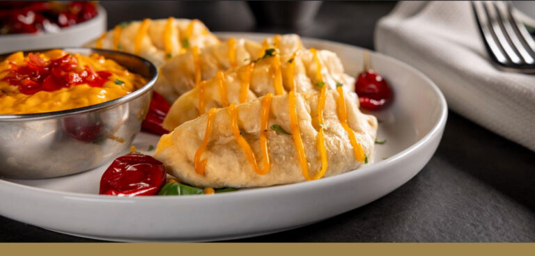 Spinach Artichoke potstickers are served with a Spicy Calabrian pepper aioli and garnished with whole Calabrian peppers. Yield: 3 serving